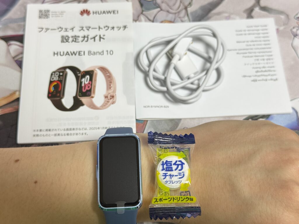 分類としてはスマートバンドなので液晶は細長く、今や夏の必須アイテムになりつつある塩分タブレットと同じぐらいの大きさです。