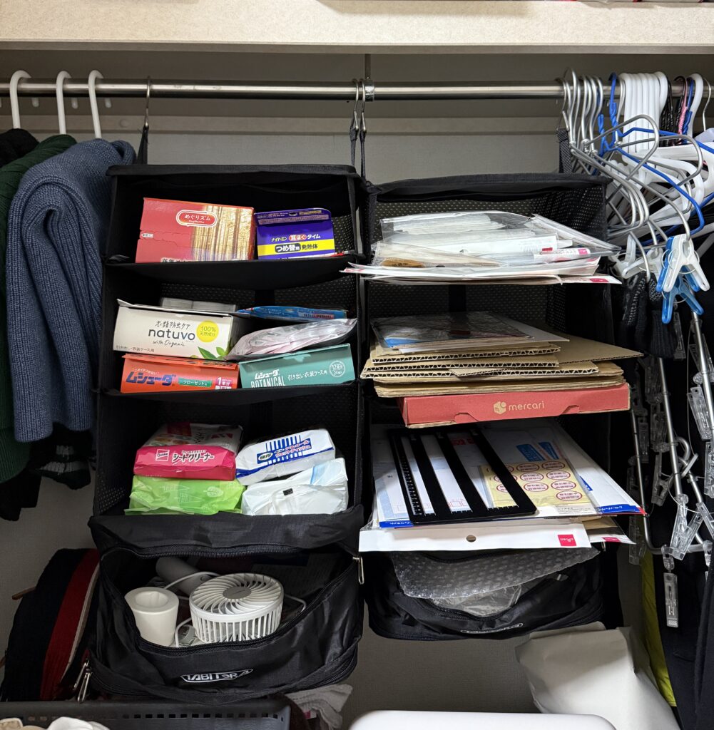 我が家のクローゼットにはフリマアプリ用の梱包材、キッチン用品や消耗品のストック、秋冬の上着などがいっぺんに詰め込まれており、非常にカオスな空間です。
